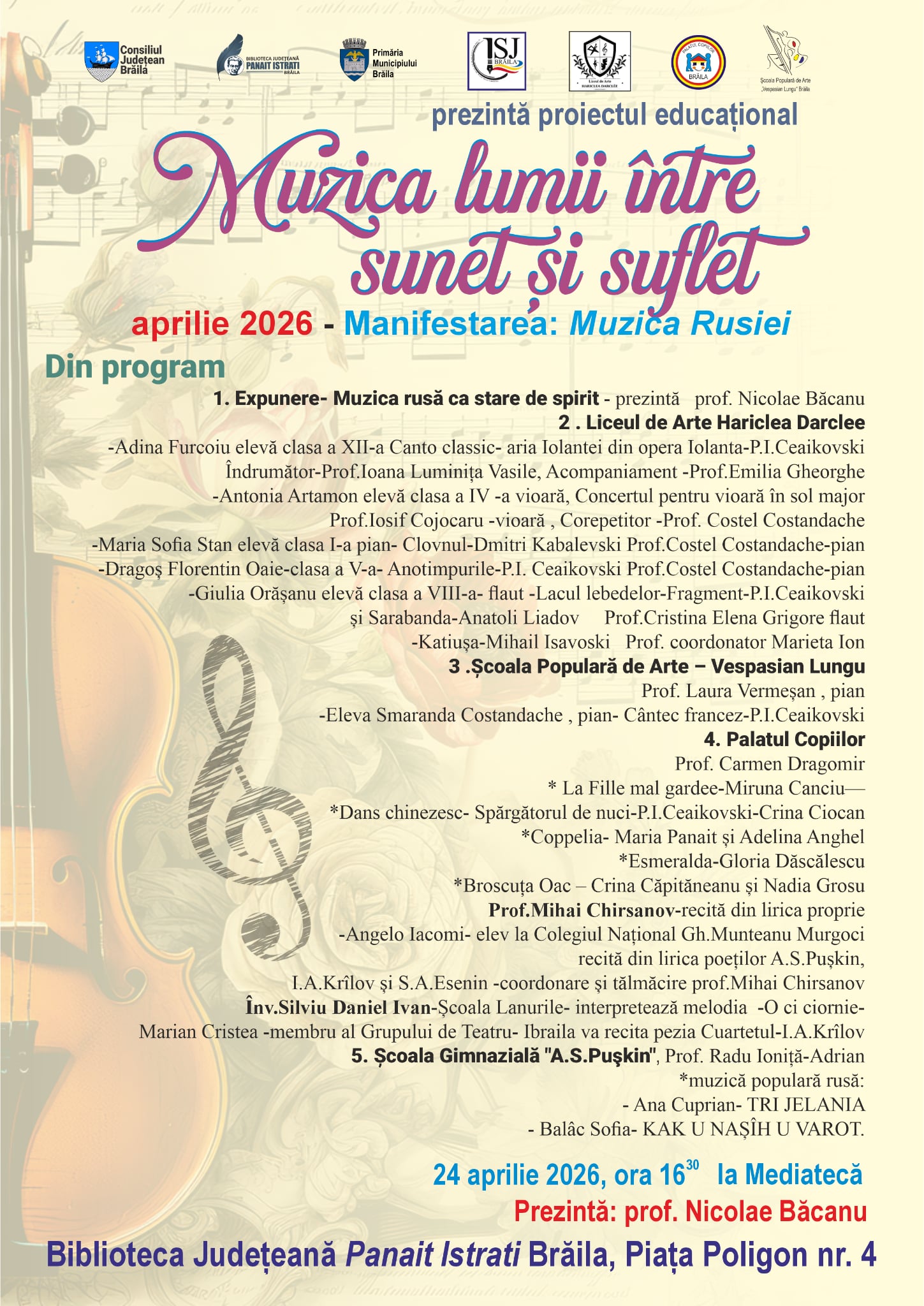 Vă invităm la un nou spectacol desfășurat în cadrul proiectului educațional „Muzica lumii între sunet și suflet”, dedicat de această dată universului artistic al Rusiei. Manifestarea „Muzica Rusiei” va avea loc pe 24 aprilie 2026, începând cu ora 16:30, la […]