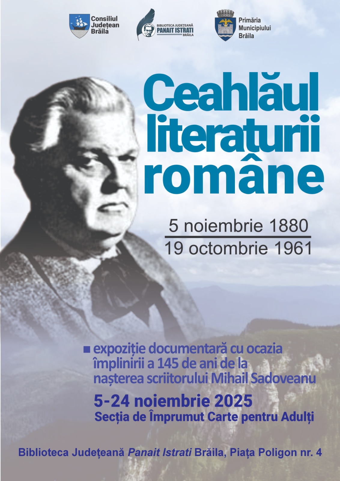 Cu ocazia împlinirii a 145 de ani de la nașterea scriitorului Mihail Sadoveanu, Biblioteca Judeteana "Panait Istrati" Braila organizează expoziția documentară "Ceahlăul literaturii române", ce poate fi vizitată la parterul Compartimentului Împrumut Carte pentru Adulți în perioada 5-24 noiembrie a.c. […]