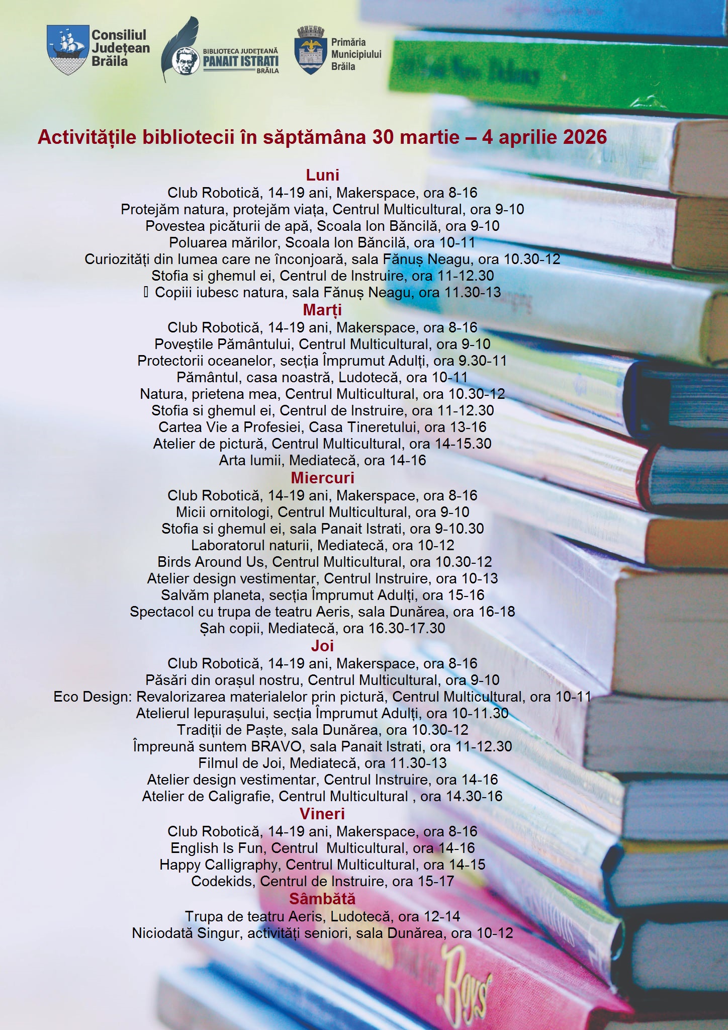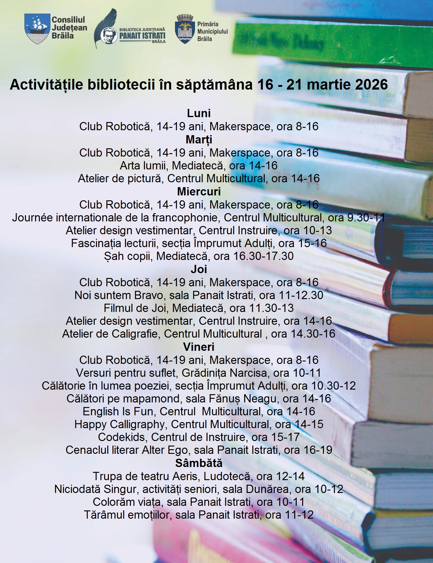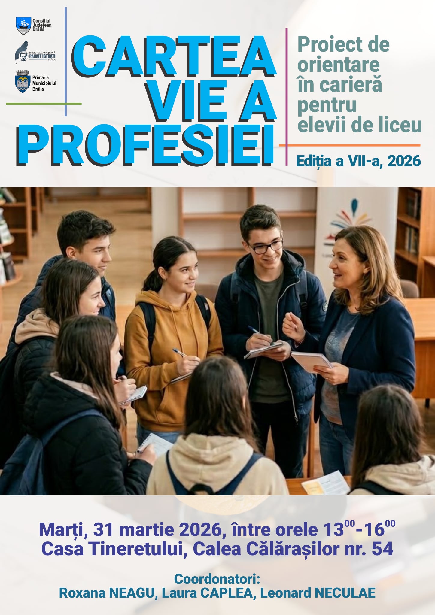 Descoperă-ți drumul: liceenii față în față cu profesiile viitorului! Biblioteca Județeană "Panait Istrati" Brăila organizează marți, 31 martie 2026, între orele 13 - 16, la Casa Tineretului, ediția a VII-a a proiectului de orientare în carieră 𝐂𝐚𝐫𝐭𝐞𝐚 𝐕𝐢𝐞 𝐚 𝐏𝐫𝐨𝐟𝐞𝐬𝐢𝐞𝐢. […] |