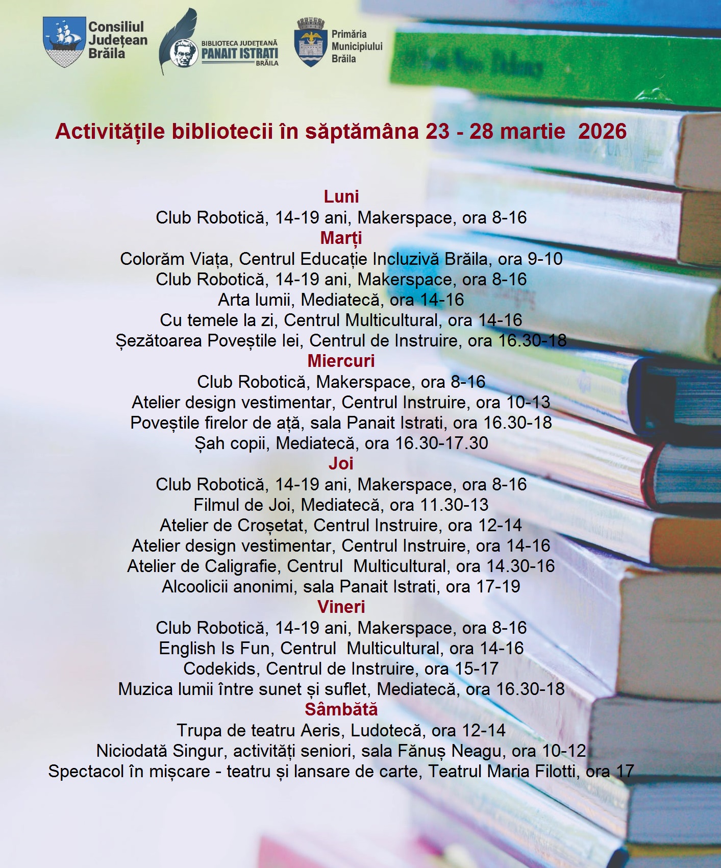 Descoperă-ți drumul: liceenii față în față cu profesiile viitorului! Biblioteca Județeană "Panait Istrati" Brăila organizează marți, 31 martie 2026, între orele 13 - 16, la Casa Tineretului, ediția a VII-a a proiectului de orientare în carieră 𝐂𝐚𝐫𝐭𝐞𝐚 𝐕𝐢𝐞 𝐚 𝐏𝐫𝐨𝐟𝐞𝐬𝐢𝐞𝐢. […] |