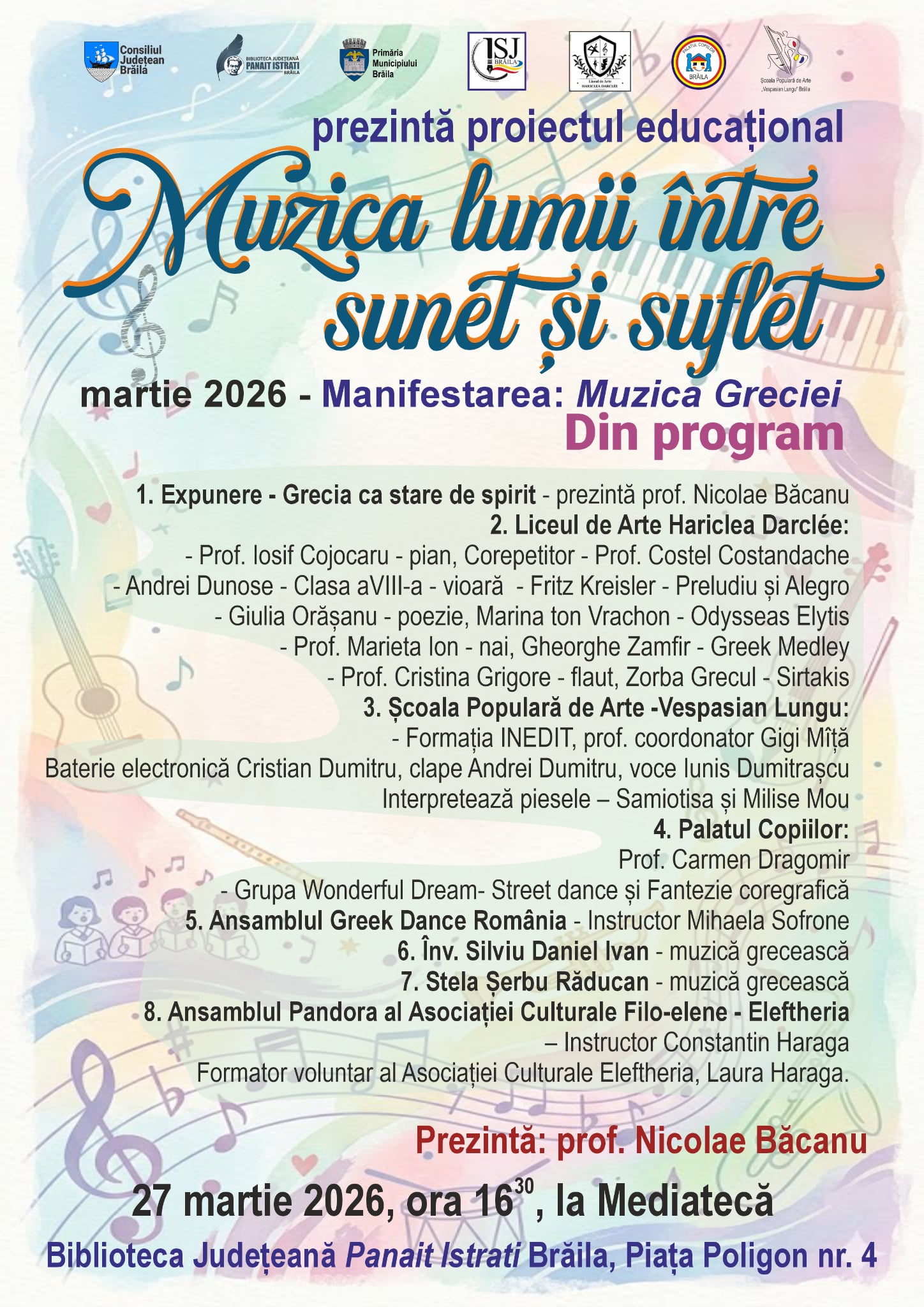 𝑴𝒖𝒛𝒊𝒄𝒂 𝒍𝒖𝒎𝒊𝒊 𝒊̂𝒏𝒕𝒓𝒆 𝒔𝒖𝒏𝒆𝒕 𝒔̦𝒊 𝒔𝒖𝒇𝒍𝒆𝒕 – eveniment dedicat muzicii grecești la Brăila Vineri, 27 martie 2026, începând cu ora 16.30, la secția Mediatecă a Bibliotecii Județene Panait Istrati Brăila are loc un spectacol artistic care își propune să aducă […] |